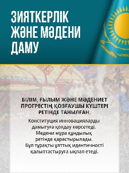 6. Білім, ғылым және мәдениет прогрестің қозғаушы күштері ретінде танылады. Мемлекет инновациялар мен шығармашылық бастамаларды қолдайды.
