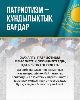 5. Жауапты патриотизм мемлекеттің негізгі қағидаттарының бірі ретінде айқындалады. Ол еңбекқорлықпен және заңға құрметпен байланыстырылады.
