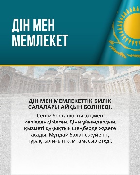 1. Жаңа Конституция жобасында дін мен мемлекеттің ара-жігі нақты ажыратылған. Әрбір азаматқа ар-ождан және дін бостандығы кепілдендіріледі.